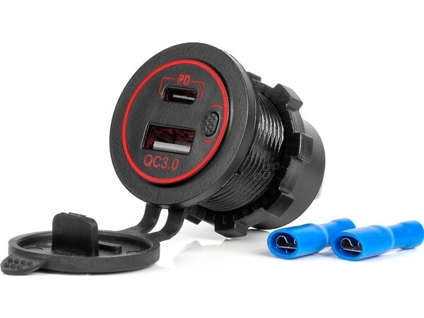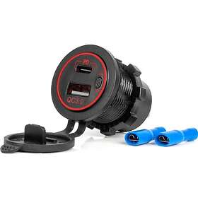 AMiO -04221 Vedenkestävä Autolaturi USB:llä ja USB-C QC3.0:lla 12V/24V