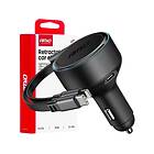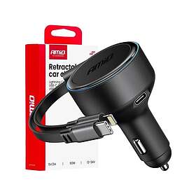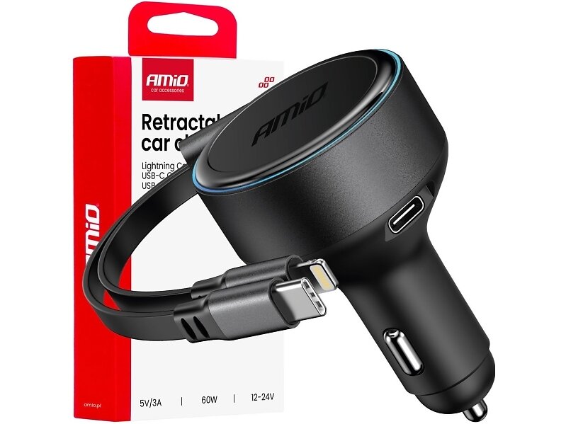 AMiO 04370 Sisäänvedettävä Autolaturi Type-C- ja Lightning-kaapelilla 60W