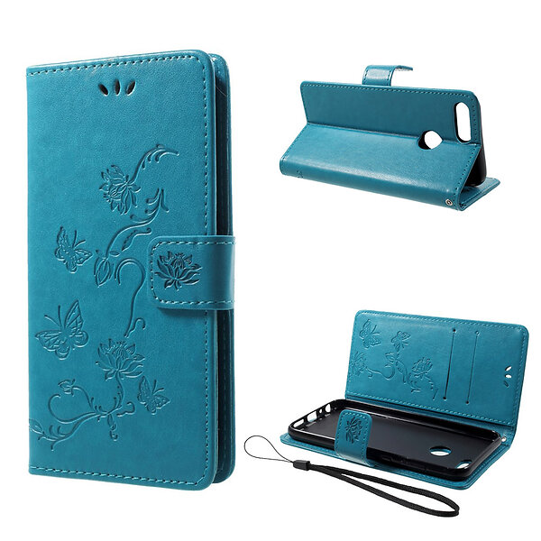 Lux-Case Honor 9 Lite / Youth Edition mobilfodral i skyddande PU läder inbyggd plånbok korthållare stående läge fjärilmönster graverad Blå