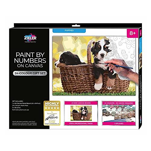ON Paint by Numbers A3 Canvas Board – Puppies 24-Colour Gift Set 3 Brushes by Zieler