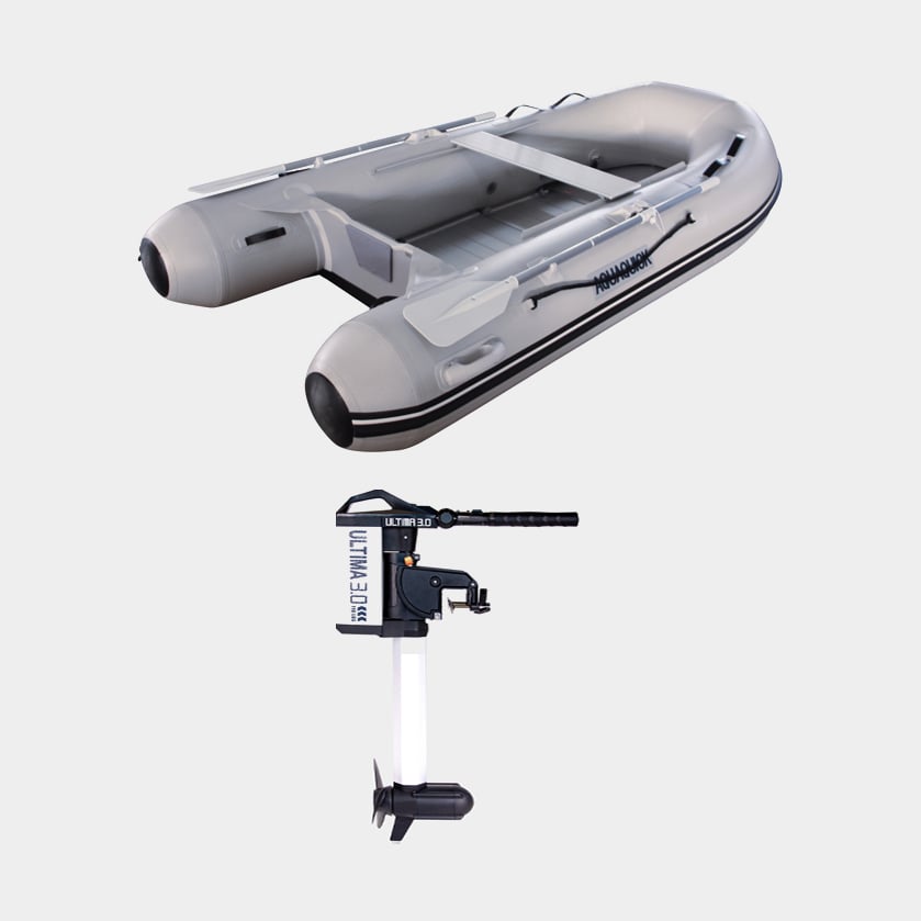 Sähkömoottorilla varustettu kumivene Aquaquick 360, alumiinipohja, harmaa + 1852-Marine 0.8 hv, 600 W, 66 cm säädettävä rikipituus + akku (80 Ah) + akkulaatikko + kaapelikengät + airot + pumppu + korjaussarja + köysi