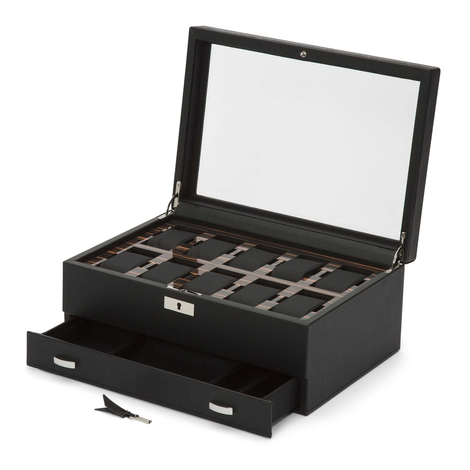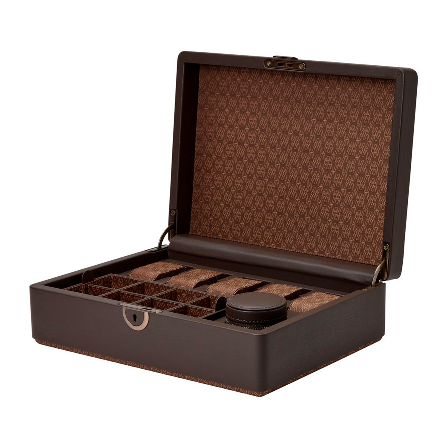 Kellorasia, 2 tasoa 12 kelloa varten, lukittava, 1 laatikko sormuksille, rannekoruille, 18,5x32,5x13,5 cm, ruskea, musta, viininpunainen