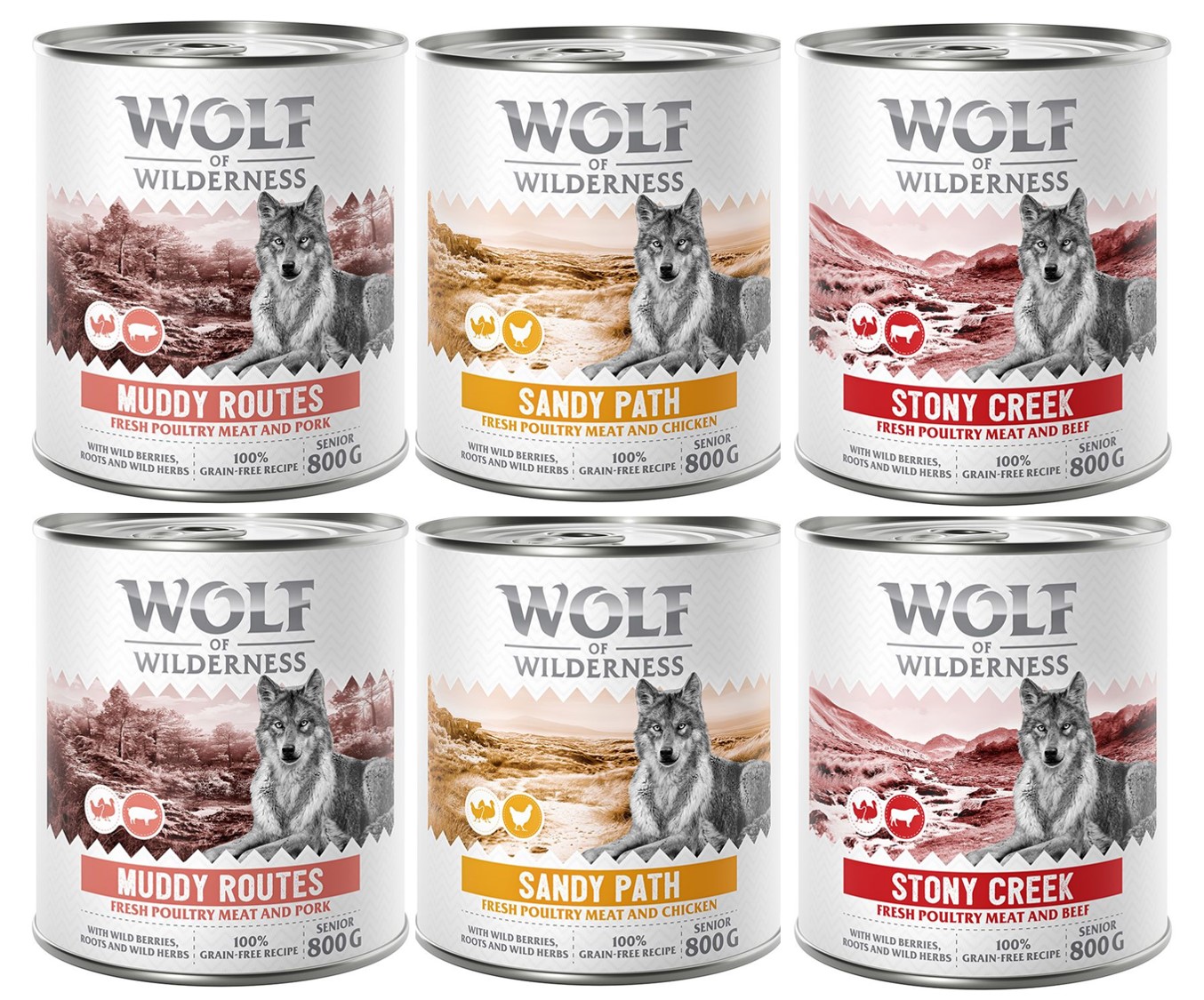 Wolf of Wilderness "Expedition" Senior 6 x 800 g - Paljon tuoretta siipikarjanlihaa mukana - lajitelma (2x Stony Creek, 2x Sandy Path, 2x Muddy Routes)