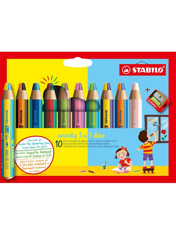 STABILO woody 3 in 1 Duo - Multitalent Coloured Pencil - Set 10 pcs. + Pencil Sharpener