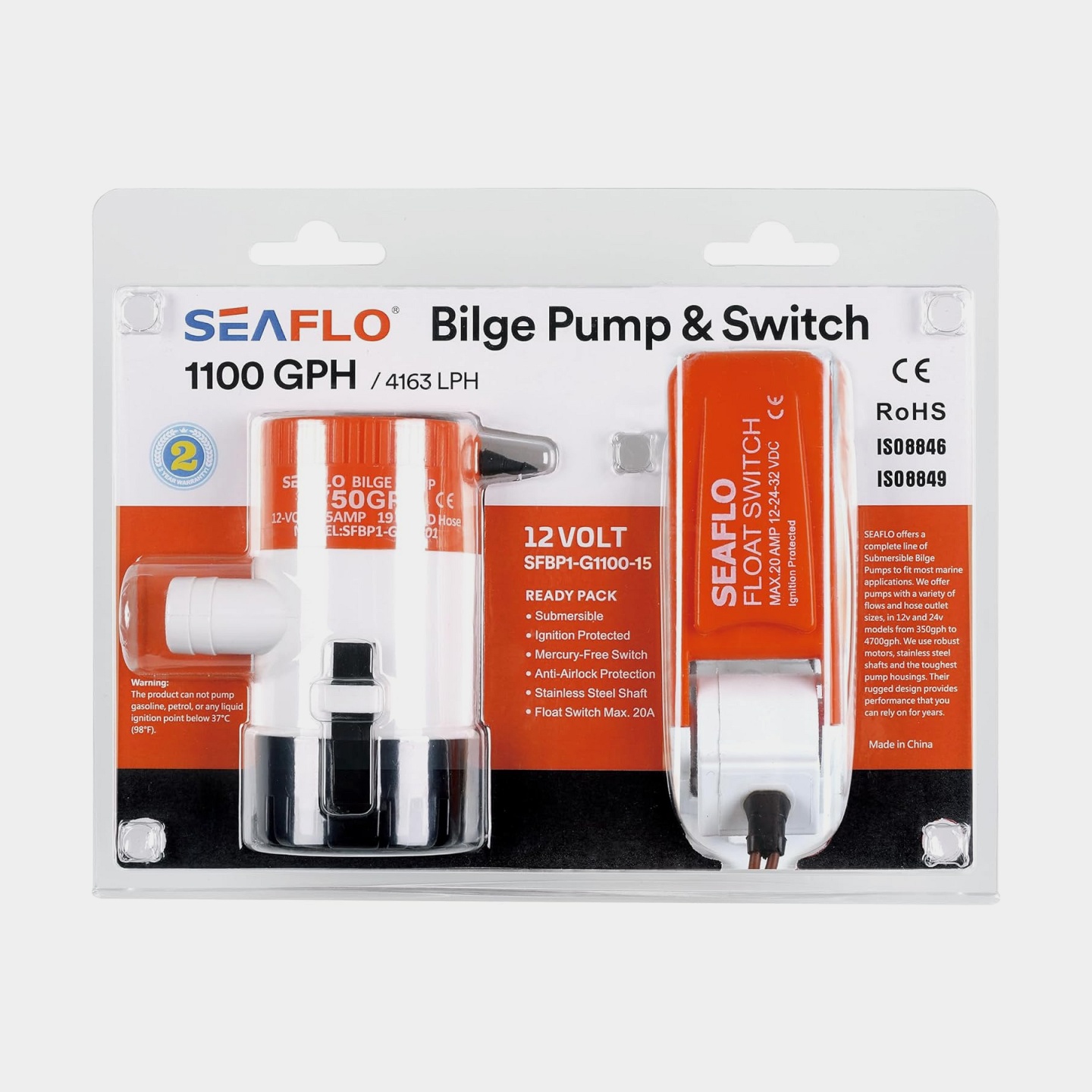 Uppoasennettava sähköinen pilssipumppu SEAFLO 14A-800 GPH (50 litraa / minuutti), 24V, automaattinen käynnistys, tasovahdilla