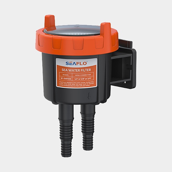 Merivesisuodatin SEAFLO Sea Water Filter 04, muovi, 23 - 51 litraa/min, 1/2" (13 mm) / 5/8" (16 mm) / 3/4" (19 mm) letku, musta/oranssi