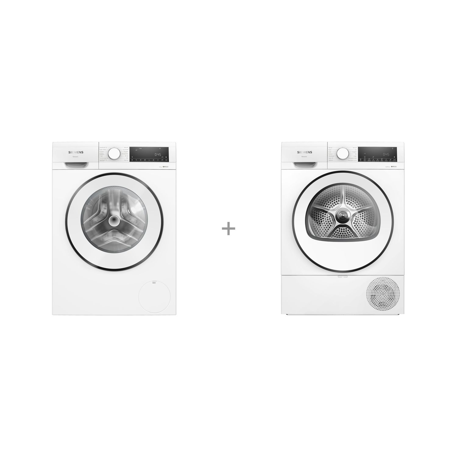 Siemens WG54G2ZWDN iQ500 pyykinpesukone + WQ42G20IDN iQ500 lämpöpumppukuivausrumpu + WZ27400 väliasennussarja aputasolla