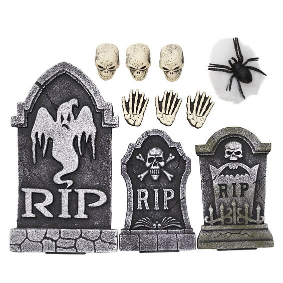 Panduro Hobby Dekorationskit i styrolit 3 gravstenar, 6 skelettdelar, spindelnät & spindlar