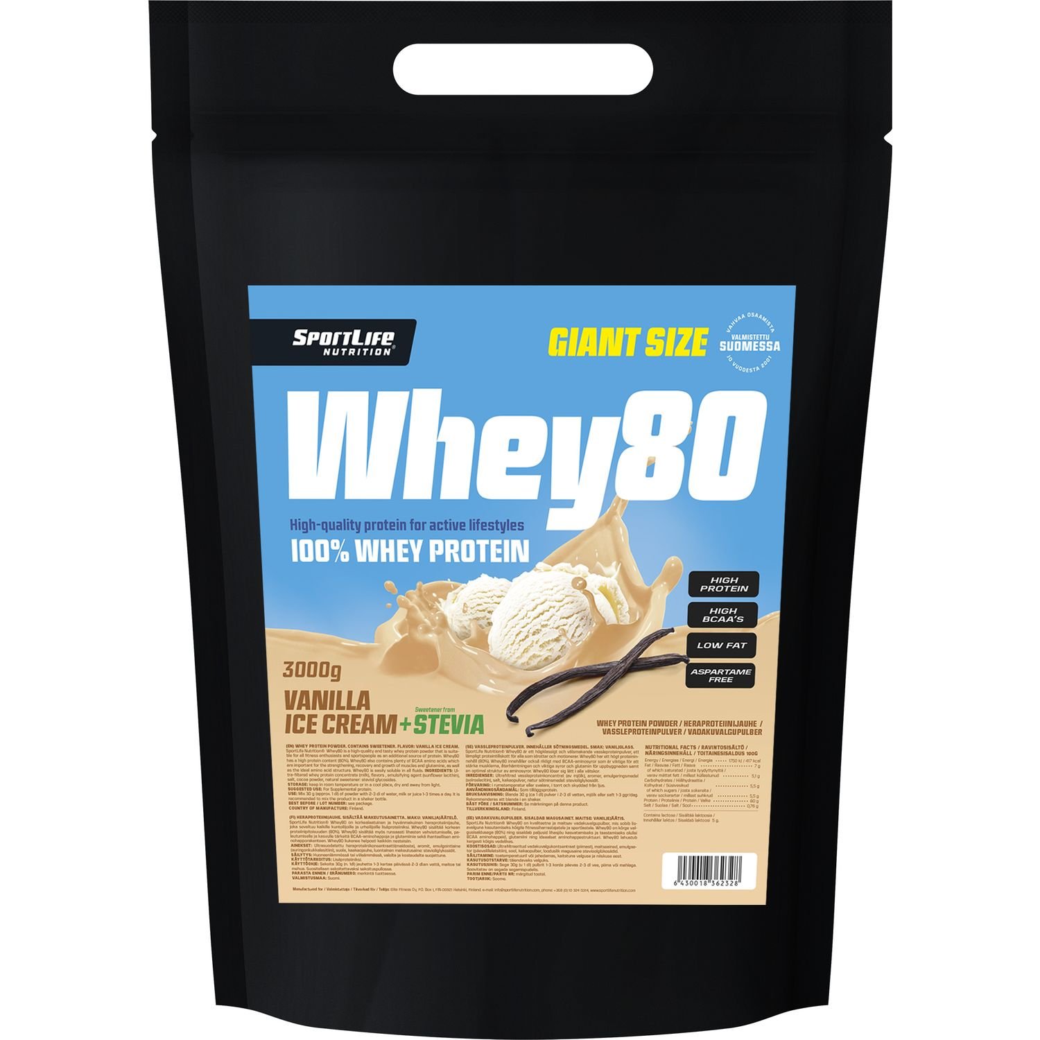 SportLife Whey80 Vanilla Ice Cream + Stevia heraproteiinijauhe, 3 kg