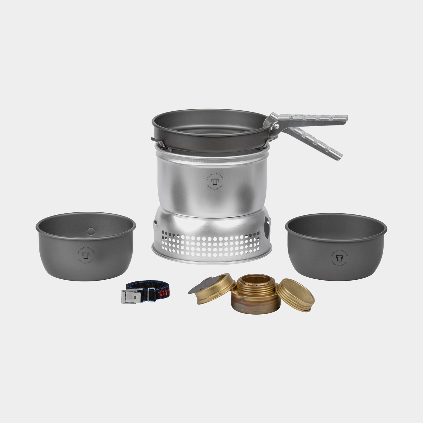 Spriihella / retkikeitin Trangia 27 Small, 1000 W + 2 kattilaa, 1 paistinpannu & tuulensuoja HA / kovaanodisoitua alumiinia + 1 kahvipannu + pihdit + hihna, + T-Tenol (1 litra)